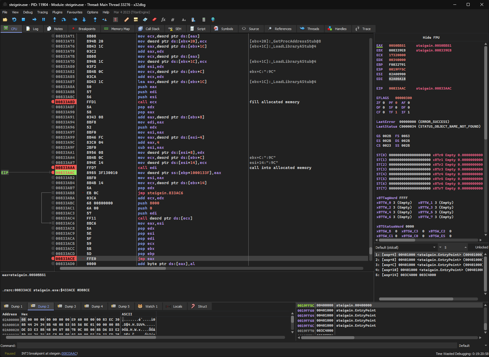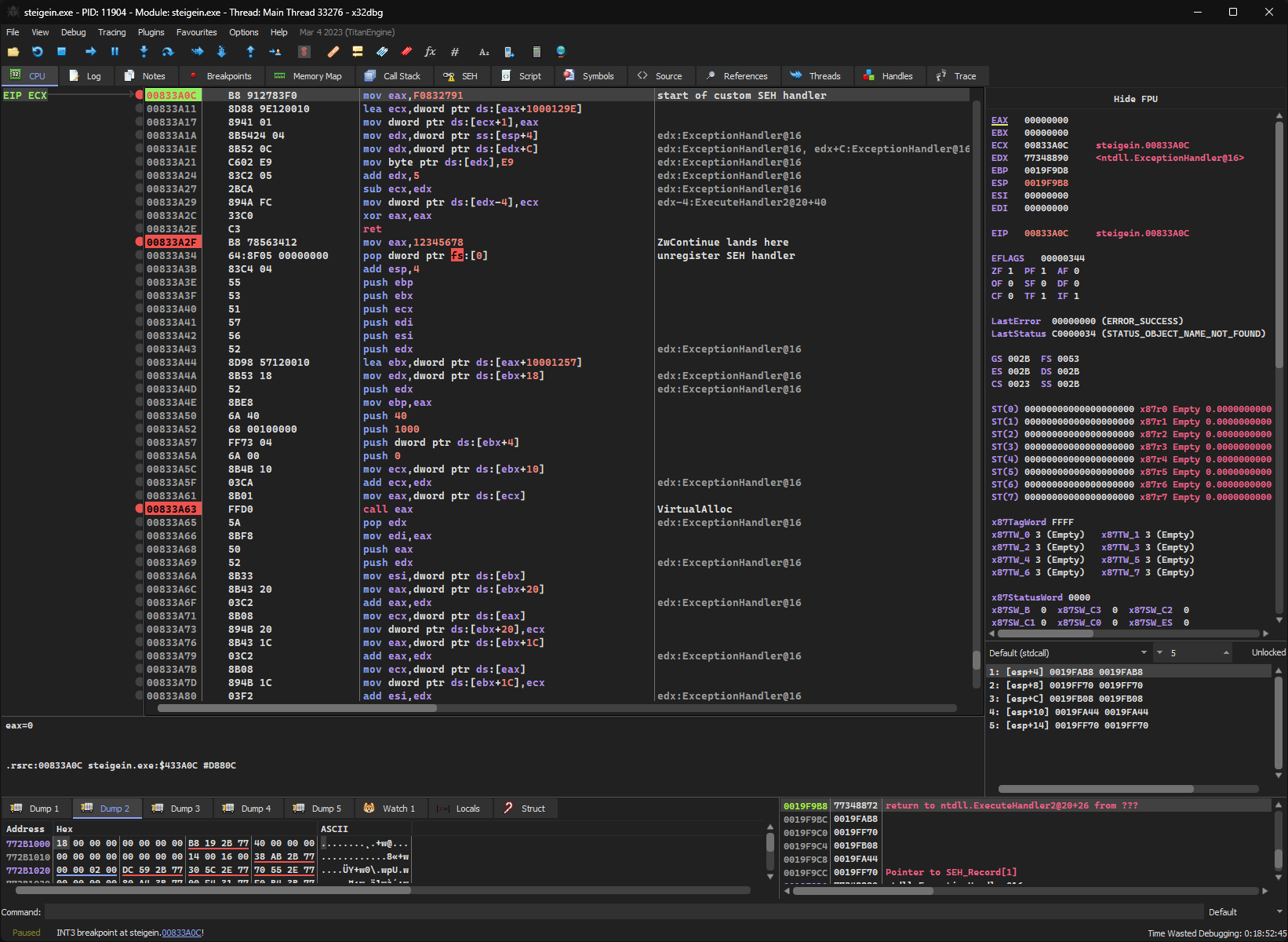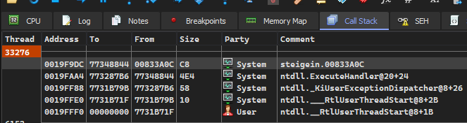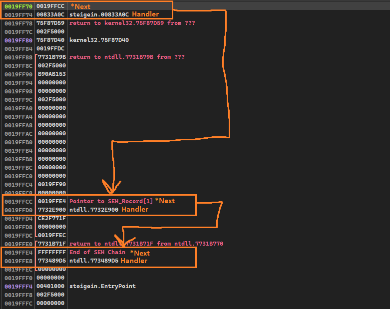 00401000 | mov eax,steigein.833A0C // 0x833A0C is the handler function