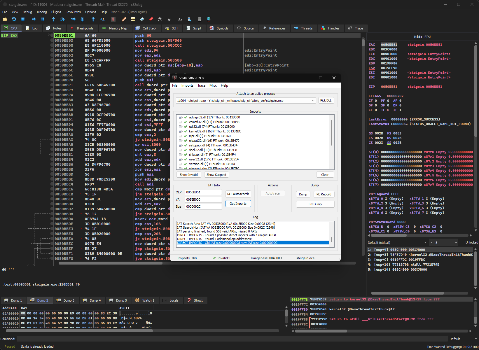 After unpacking, the original Import Directory is not available as it is the unpacking code that resolves the imports. The Scylla plugin of x64dbg can find the populated IAT and reconstruct the original Import Directory, given the OEP which we now know. The resulting PE file can then be dumped on disk.