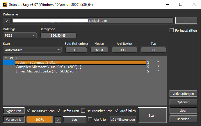 ./steigein.exe: PE32 executable (GUI) Intel 80386, for MS Windows, PECompact2 compressed, 2 sections