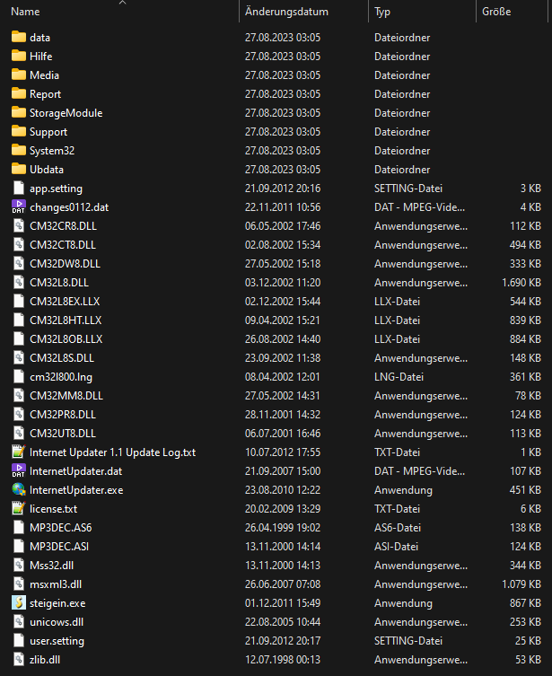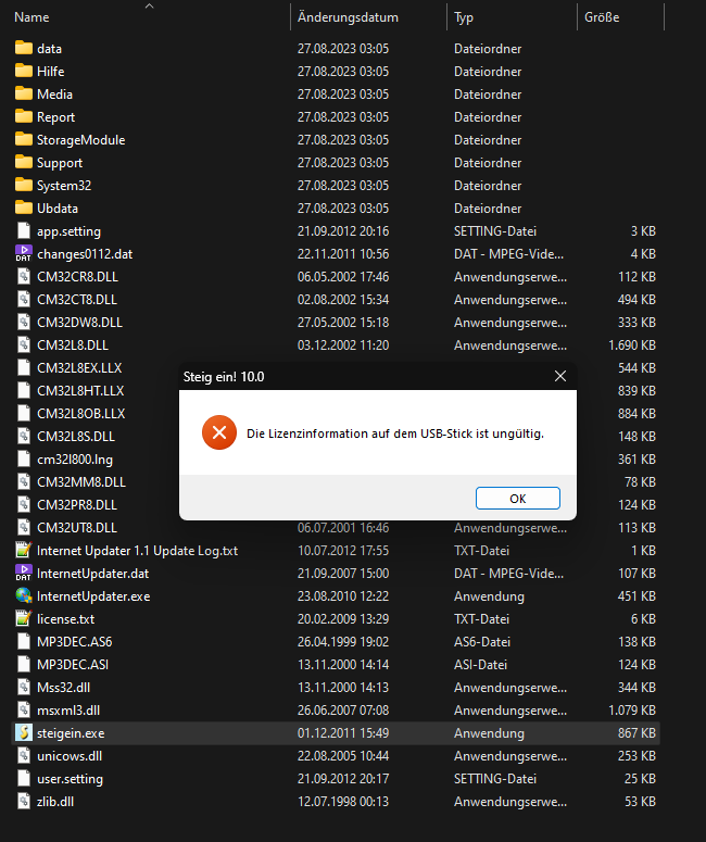 The directory structure is nothing special, there is the main executable steigein.exe which launches the main program, as well as another executable InternetUpdater.exe which can be used to update the software. When I tried to start the main program, a window popped up, stating: