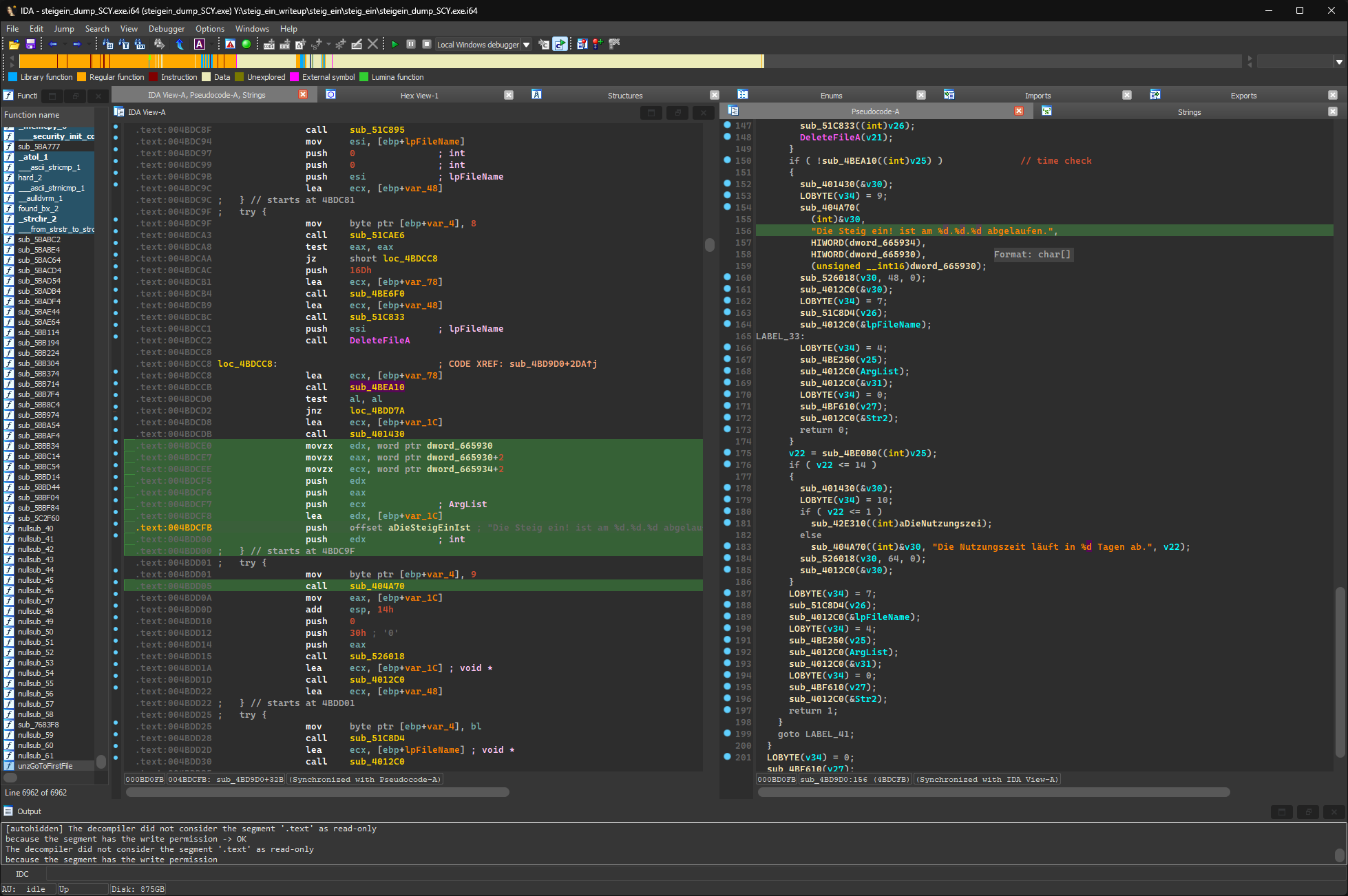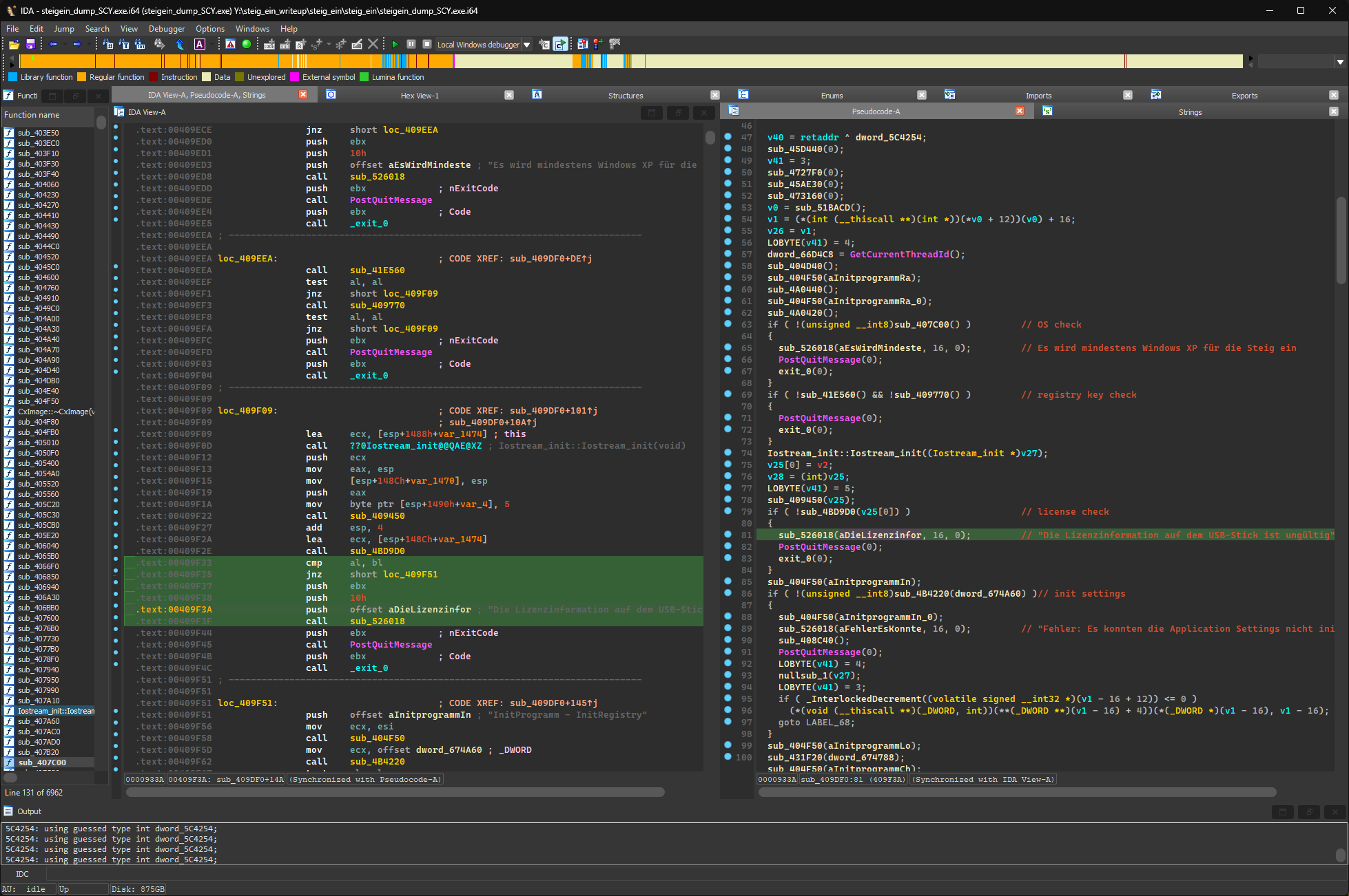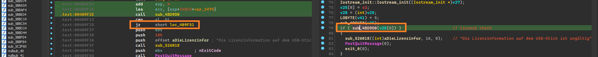 With the unpacked executable at hand, we can now further analyze it in IDA. First I was looking for the “invalid license information” string that is shown in the message box, in order to locate the license check. However, IDA had problems defining some of the strings due to different string encodings being used. I had to manually go through a chunk of undefined strings and manually define them using the Windows-1252 encoding. The “invalid license information” string is cross referenced in only one location which can be seen on the screenshot.