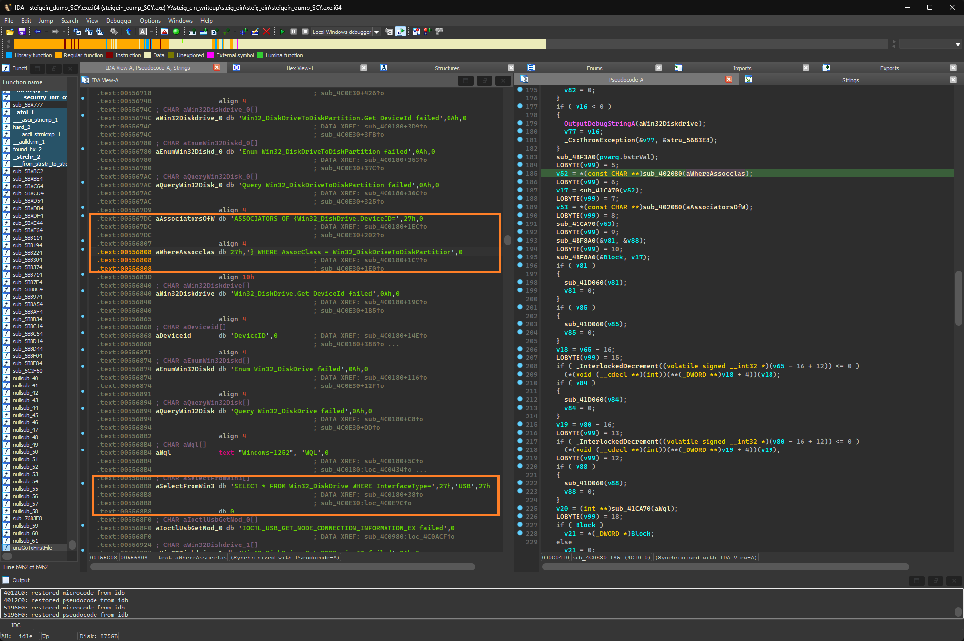Somewhere in the license check subroutine there are several WMI query strings referenced. These queries check if the program is run on a valid USB drive.