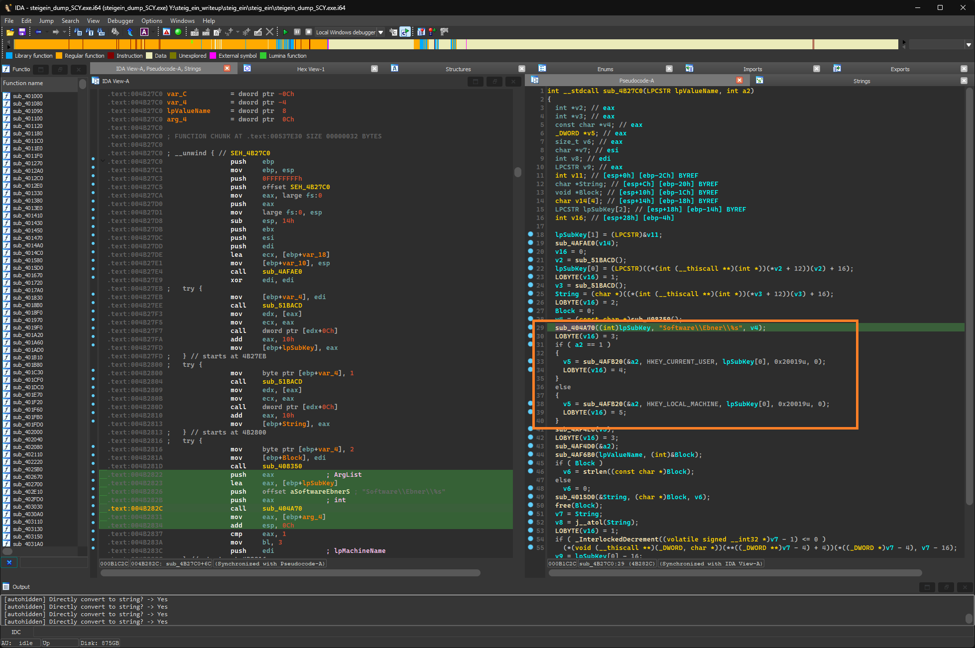 This function is called early on when the program is started and seems to perform various checks in order for the application to run. For example, in line 63 of the decompilation view, the function sub_407C00 checks the version of the OS to be at least Windows XP, in line 69 sub_41E560 performs some registry checks for the StorageModule library, which I assume is used for generating the learning reports which you can print out. Every one of these checks is an if block, and if the check fails, PostQuitMessage(0) is called followed by an exit(0). Line 79 is the license check (sub_4BD9D0), which can be derived by the “invalid license” error message that gets passed inside the if block (which gets executed when the check fails).