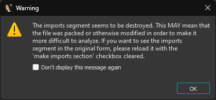 Naturally, I was interested in how the license validity check is performed, so I decided to look further into it. However, when I tried to open the binary file in IDA, it showed a message indicating that the executable file was packed.