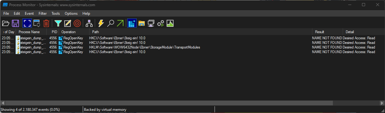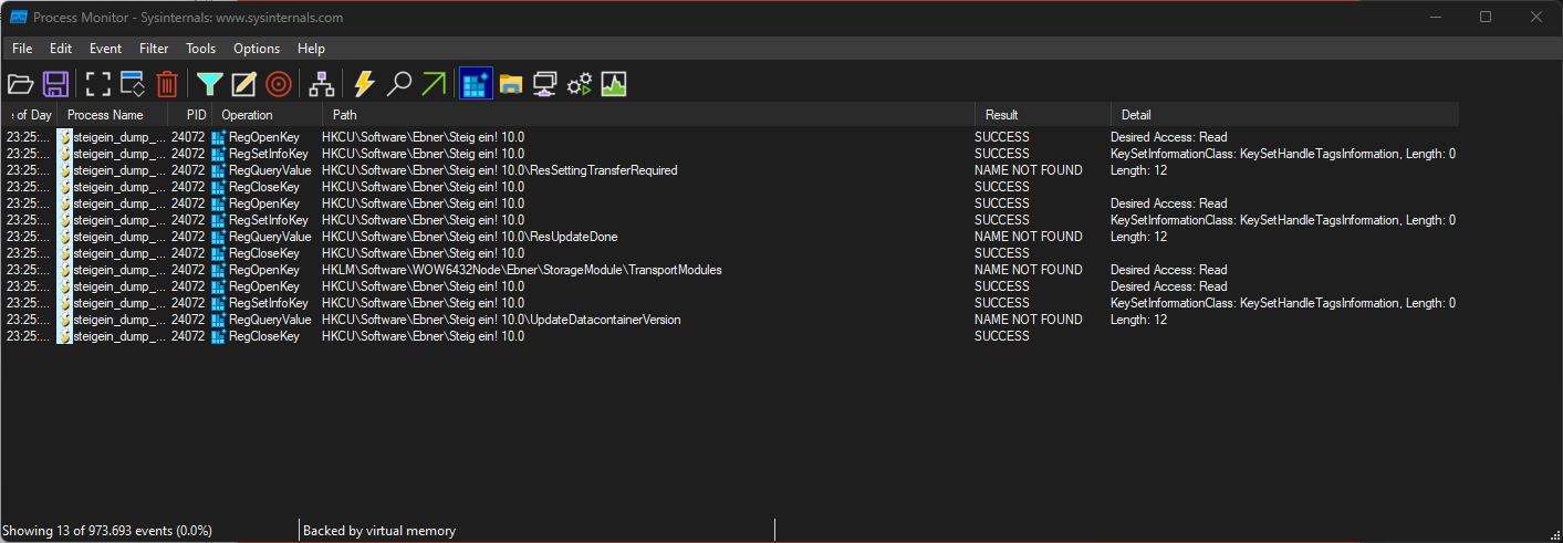 You can see that the application tries to access the key HKEY_CURRENT_USER\Software\Ebner\Steig ein! 10.0. I created the key and ran the program again.