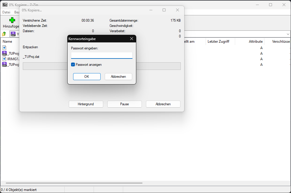 I figured that InternetUpdater.exe extracts this archive at some point, so the password must be stored in the binary file. I searched for various string references, in order to find it. In the 7-Zip window, you can see the name of the file _TUProj.dat, and when you search for this string reference, a suspicious value is stored in its vicinity.